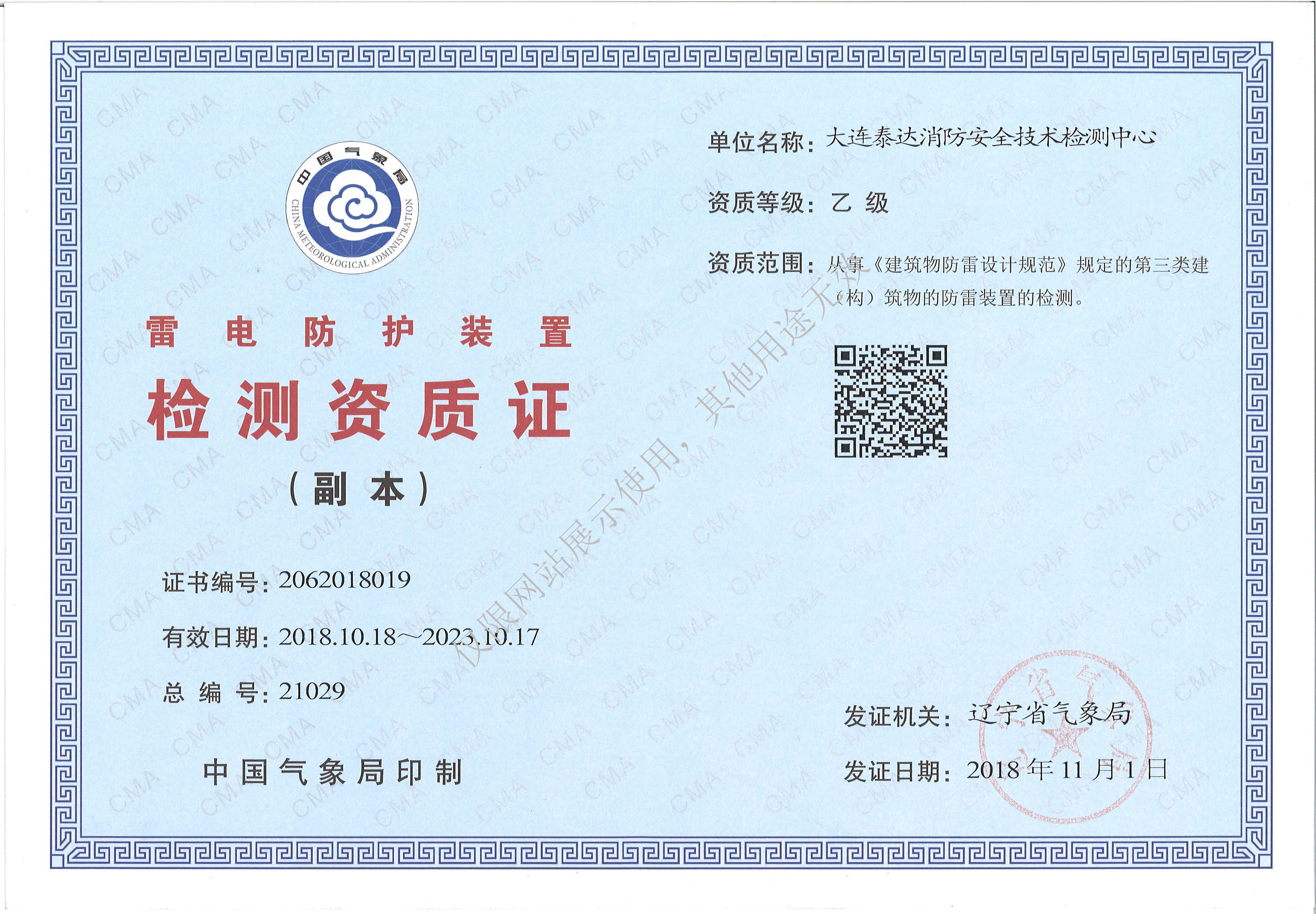· 是經(jīng)“社會(huì)消防技術(shù)服務(wù)信息系統(tǒng)”備案并公示的消防技術(shù)服務(wù)機(jī)構(gòu),已取得中國(guó)氣象局頒發(fā)的雷電防護(hù)裝置檢測(cè)資質(zhì)證書、遼寧省質(zhì)量技術(shù)監(jiān)督局審核批準(zhǔn)的檢驗(yàn)檢測(cè)機(jī)構(gòu)資質(zhì)認(rèn)定證書(CMA)及包括消防檢測(cè)、電氣檢測(cè)、雷電防護(hù)裝置檢測(cè)、防火涂層厚度檢測(cè)等在內(nèi)的200余項(xiàng)檢驗(yàn)檢測(cè)能力,取得大連市應(yīng)急管理局頒發(fā)的安全生產(chǎn)標(biāo)準(zhǔn)化證書,獲得質(zhì)量管理體系、環(huán)境管理體系、職業(yè)健康安全管理體系認(rèn)證證書,是經(jīng)備案的高新技術(shù)企業(yè),可獨(dú)立出具具有證明作用的檢測(cè)報(bào)告。